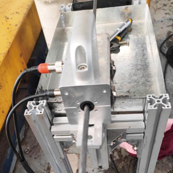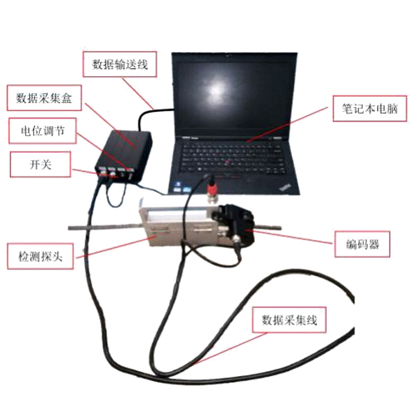 电梯便携式钢丝绳探伤仪由检测探头 (包含编码器) 、数据采集卡、笔记本电脑 (内包含数据分析处理软件) 和数据采集/输送线构成。